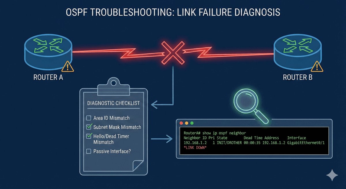 Pamiętaj: w OSPF routery muszą być jak lustrzane odbicia. Jeśli jeden chce wysyłać Hello co 10 sekund, a drugi co 30 — nigdy się nie dogadają. Diagnostyka to systematyczne sprawdzanie tych parametrów aż do momentu, gdy stan sąsiedztwa zmieni się na upragnione 'FULL'.