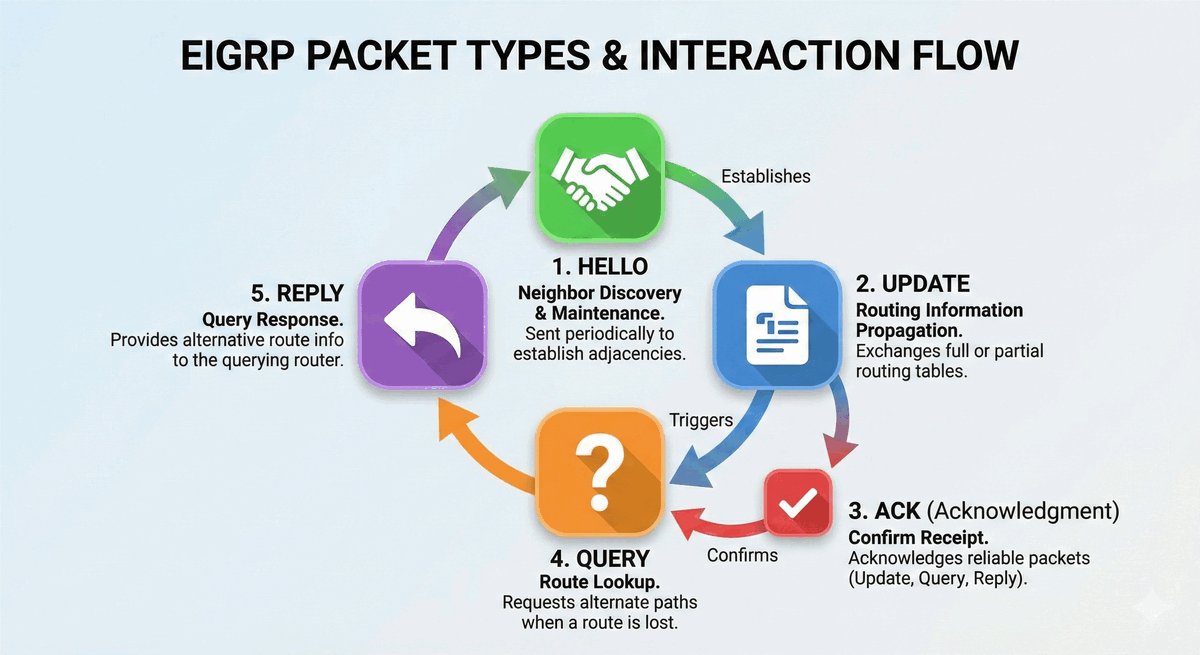 EIGRP używa pięciu rodzajów komunikatów. Hello (odkrywanie sąsiadów), Update (przesyłanie tras), Query (pytania przy awarii), Reply (odpowiedzi na pytania) oraz Ack (potwierdzenia odbioru). Co ważne, EIGRP ma własny system transportu (RTP), który dba o to, aby żaden ważny Update nie zginął po drodze.