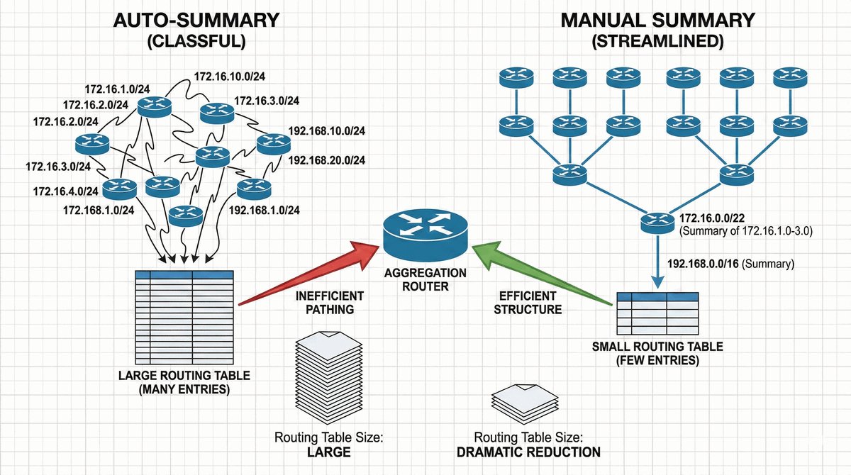 EIGRP potrafi „sprzątać" tablice routingu, aby nie były przeładowane tysiącami szczegółowych wpisów. Służy do tego sumaryzacja. Stary mechanizm auto-summary działał samoczynnie, ale często psuł routing w nowoczesnych sieciach, dlatego zawsze go wyłączamy (no auto-summary).