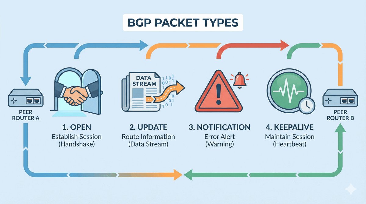 Routery BGP rozmawiają spokojnie i oszczędnie. Zaczynają od pakietu OPEN (uścisk dłoni i ustalenie zasad). Najważniejsze są pakiety UPDATE — to w nich przesyłane są nowe trasy lub wycofywane te, które przestały działać.