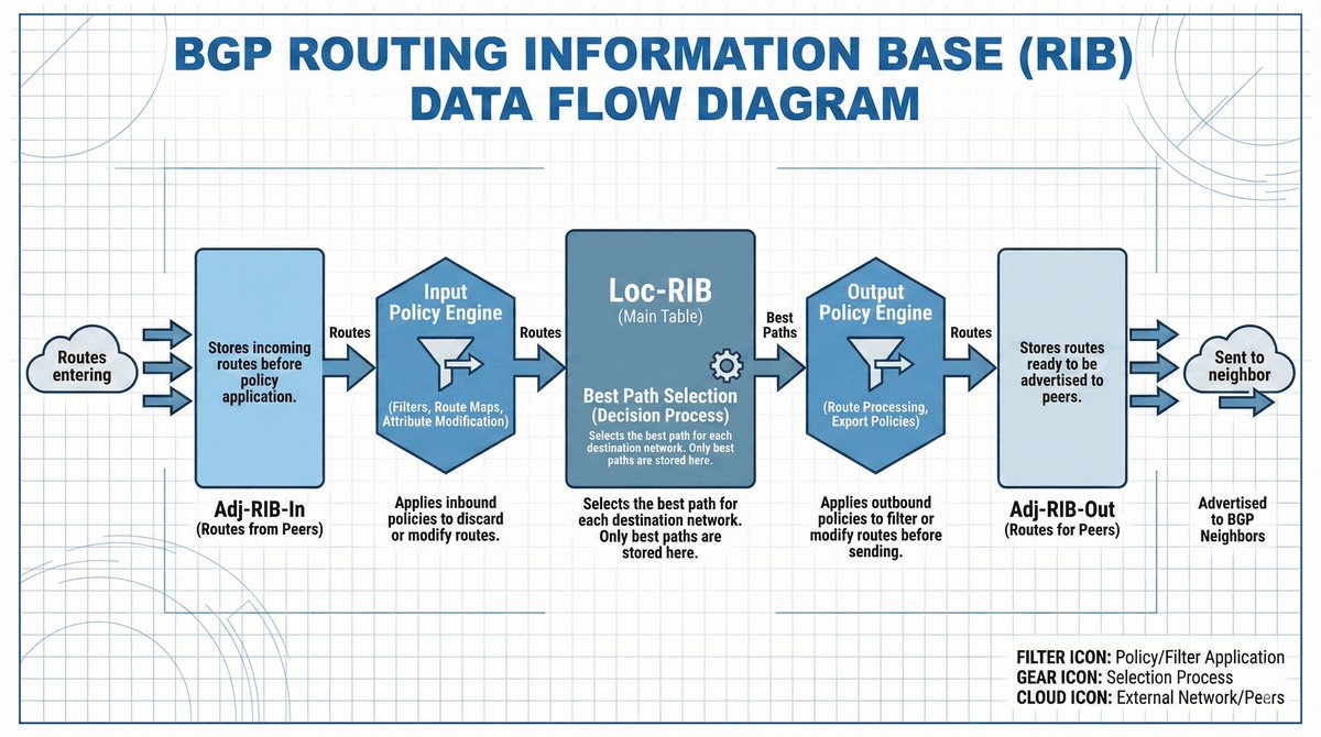 Router BGP to wytrawny analityk. Wszystkie informacje od sąsiadów zbiera najpierw w tablicy Adj-RIB-In (to nasze „surowe dane"). Dopiero po przejściu przez filtry bezpieczeństwa i polityki firmy, najlepsze kąski trafiają do tablicy głównej Loc-RIB.