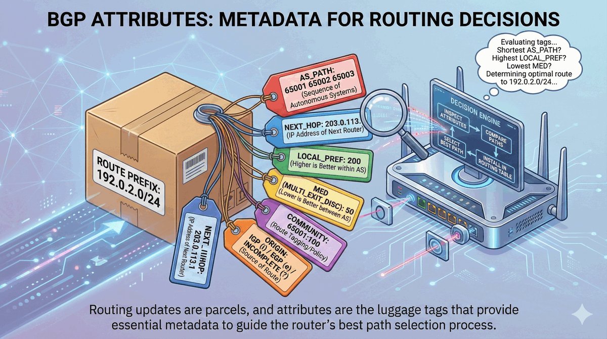 Atrybuty BGP to dodatkowe parametry doklejone do każdej trasy. To one czynią ten protokół tak potężnym. Można je porównać do filtrów w sklepie internetowym: cena (koszt), czas dostawy (opóźnienie), opinie (AS_PATH).