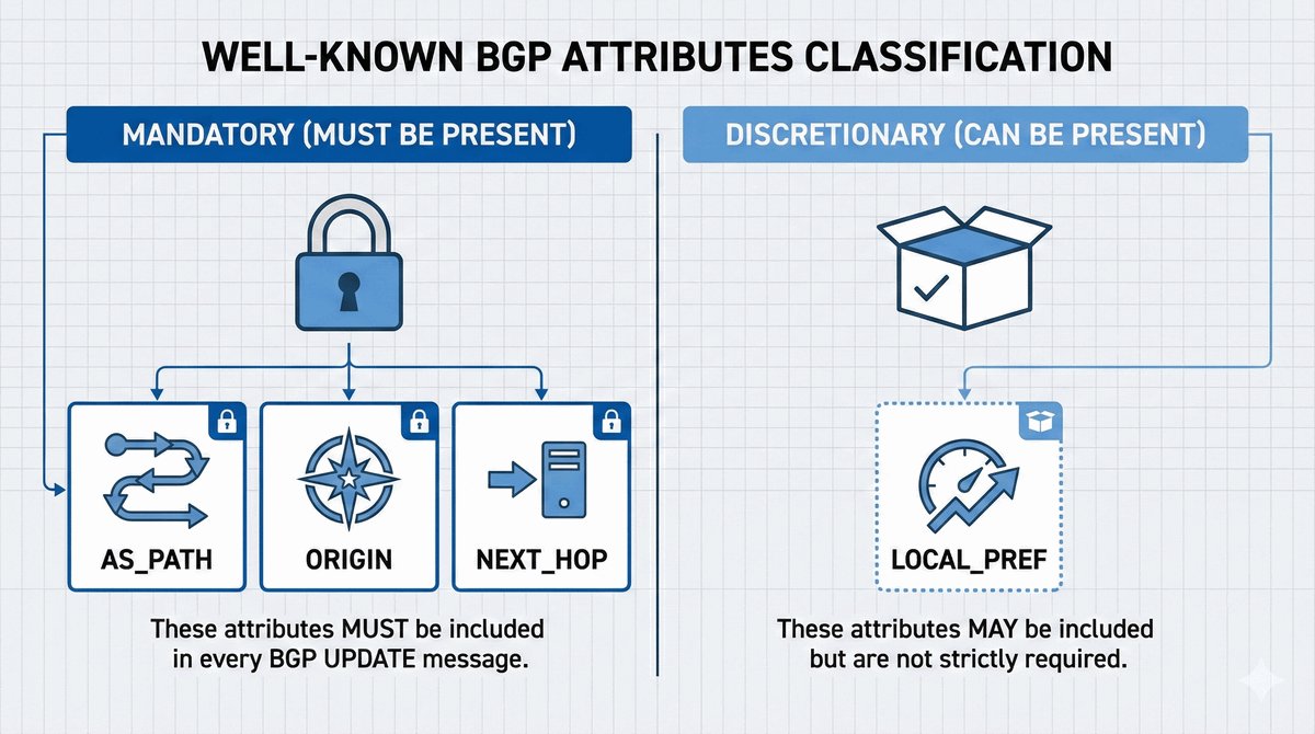 Niektóre atrybuty są tak ważne, że muszą być w każdym pakiecie BGP (Well-Known Mandatory). Najważniejsze to: AS_PATH (lista krajów po drodze), NEXT_HOP (do kogo wysłać) oraz ORIGIN (skąd router o tej trasie wie).