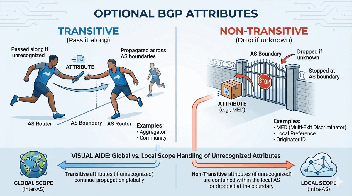 Istnieją atrybuty, które nie każdy router musi znać (Optional). Dzielimy je na „przechodnie" (Transitive) — jeśli router ich nie zna, to po prostu podaje je dalej nienaruszone, oraz „nieprzechodnie" (Non-Transitive) — jeśli router ich nie rozumie, to wyrzuca je do kosza przed wysłaniem informacji dalej.