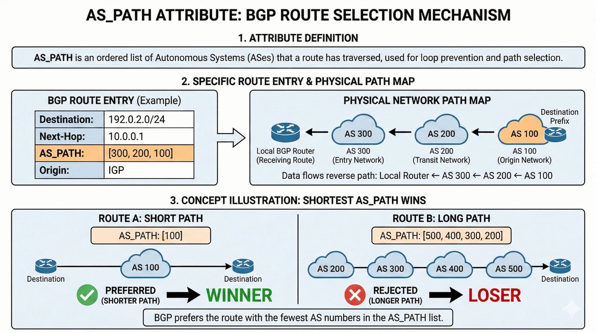 Atrybut AS_PATH to historia podróży pakietu. Wyobraź sobie drogę: AS 200 -> AS 100 -> Moja Sieć. Przy wyborze trasy BGP zazwyczaj kieruje się zasadą: im krótsza lista numerów AS, tym lepsza trasa. To logiczne — mniej pośredników oznacza zazwyczaj mniejszą szansę na awarię i szybszą transmisję.