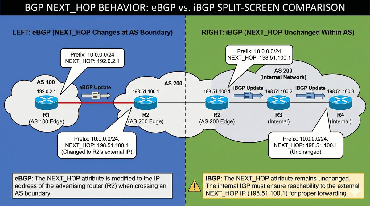 Dla inżyniera oznacza to konieczność zapewnienia, aby każdy router w firmie wiedział, jak fizycznie dojść do tego adresu NEXT_HOP (zwykle używamy do tego OSPF lub EIGRP). Jeśli router nie wie, jak dotrzeć do „następnego skoku", trasa BGP mimo że poprawna, będzie bezużyteczna i nie pojawi się w tablicy routingu.