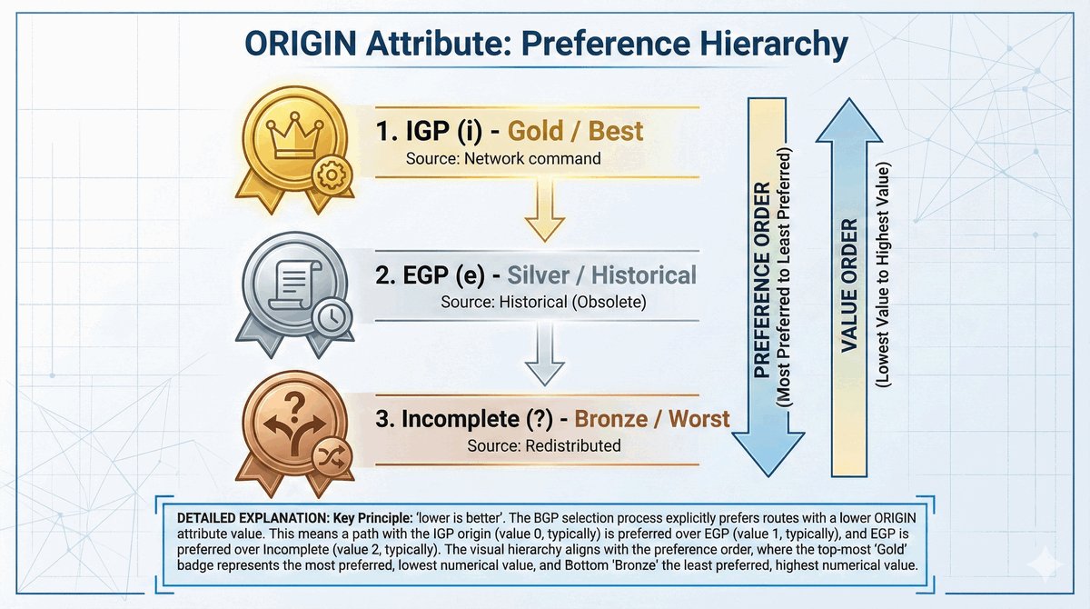Atrybut ORIGIN informuje nas, skąd dana trasa wzięła się w systemie BGP. Mamy trzy stopnie zaufania. Najwyższy to 'i' (IGP) — oznacza trasę wpisaną świadomie przez administratora (komenda network). Drugi, rzadki już dziś, to 'e' (EGP — stary protokół).
