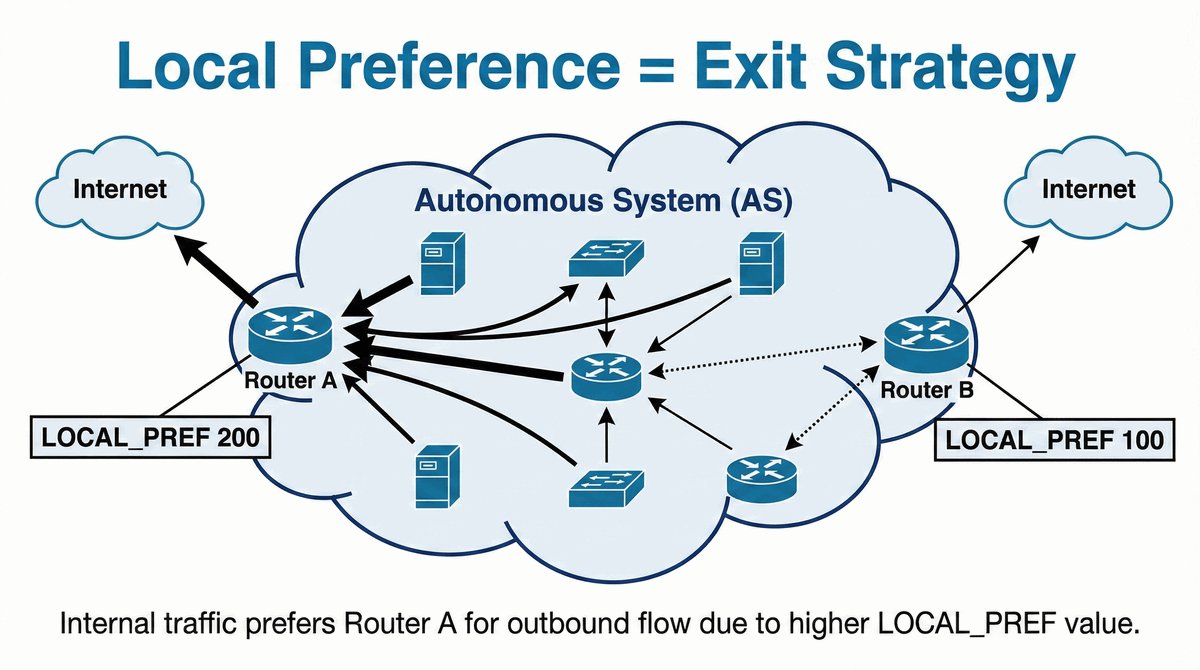 Jeśli Twoja firma ma dwóch dostawców internetu (ISP A i ISP B), atrybut LOCAL_PREF pozwoli Ci zdecydować, którego wolisz. To parametr o zasięgu lokalnym — ustawiasz go na swoich routerach i rozsyłasz po całej firmie przez iBGP.