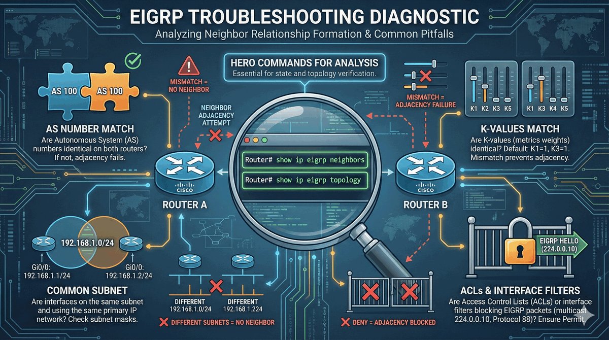 Najczęstszy problem inżyniera to brak sąsiedztwa w EIGRP. Pierwsza rzecz do sprawdzenia? Numer Systemu Autonomicznego (AS). Jeśli na jednym routerze wpiszesz 100, a na drugim 200 — nigdy się nie „zobaczą". To tak, jakby dwaj ludzie próbowali rozmawiać na innych częstotliwościach radiowych.