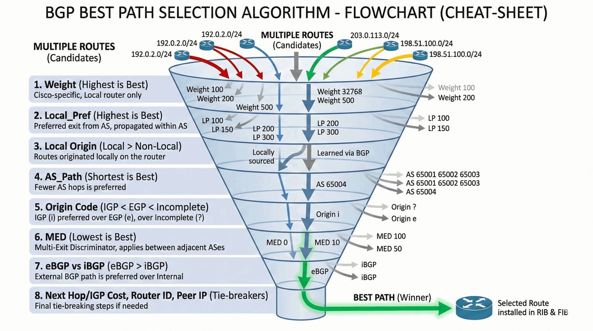 Zrozumienie tej hierarchii to „święty graal" inżyniera BGP. Znając kolejność (Weight -> Local_Pref -> AS_Path -> Origin -> MED...), wiemy dokładnie, który parametr zmienić, aby pakiety przestały płynąć drogą A i zaczęły płynąć drogą B. To precyzyjne sterowanie krwiobiegiem globalnej sieci.