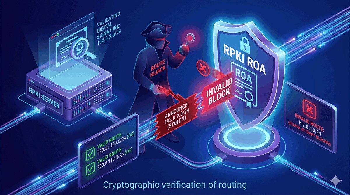 Dzięki RPKI Twój router może sprawdzić: „Czy ten facet, który mówi, ��e jest z AS 100 i ma tę sieć, ma na to ważny papier?". To rewolucja w bezpieczeństwie internetu — system zaufania kryptograficznego, który powoli eliminuje największą bolączkę globalnej sieci, czyniąc ją odporną na kradzieże tożsamości sieciowej.