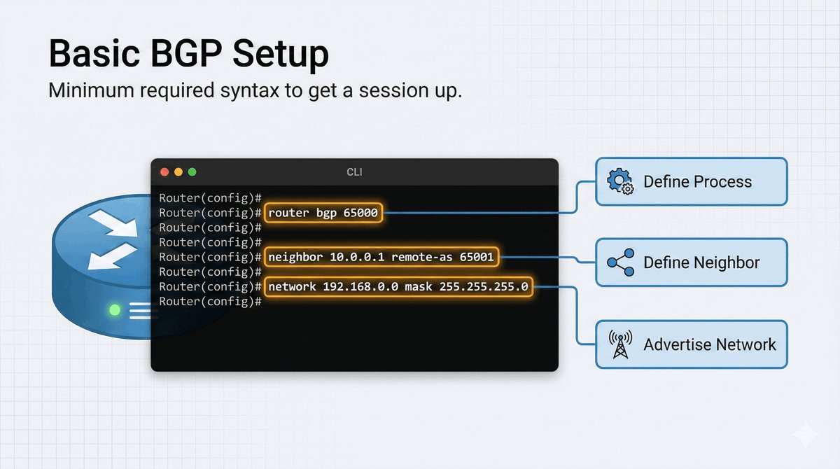 Uruchomienie BGP zaczynamy od router bgp [ASN]. Potem definiujemy sąsiada: neighbor [IP] remote-as [ASN_sąsiada]. Dopiero gdy sesja „wstanie" (stan Established), możemy zacząć ogłaszać własne podsieci za pomocą komendy network (pamiętając o masce!).