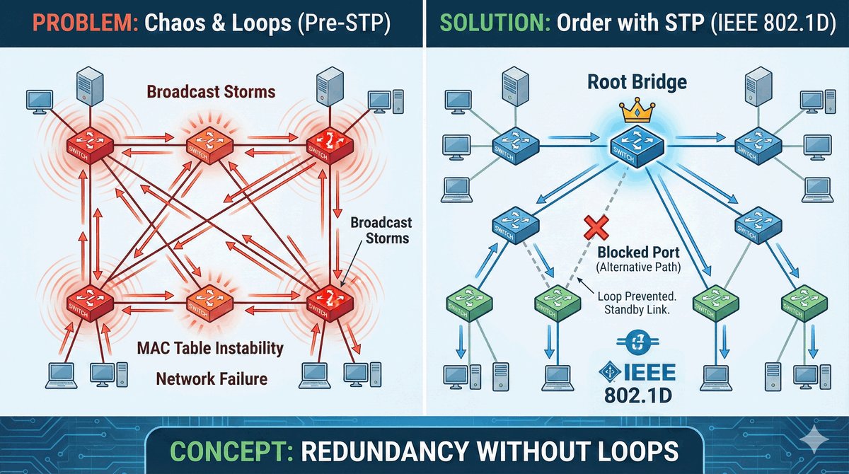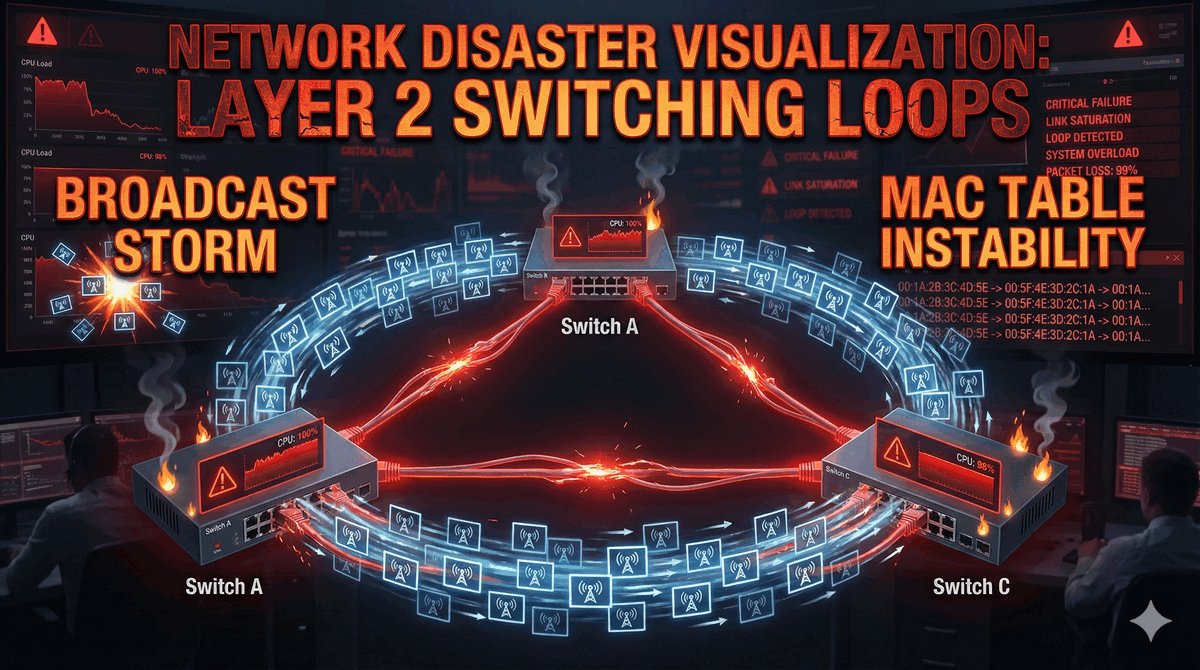 Chcemy mieć dwa kable między przełącznikami na wypadek awarii — to świetny pomysł! Ale bez odpowiedniego protokołu, to recepta na katastrofę. W warstwie 2 pakiety nie mają licznika TTL (czasu życia), więc jeśli wpadną w pętlę, będą krążyć wiecznie, powielając się miliony razy na sekundę.