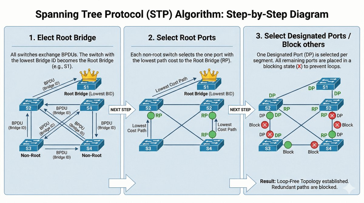 Abyśmy mogli bezpiecznie łączyć switche wieloma kablami, powstał STP (Spanning Tree Protocol). Jego rola jest prosta: ma tak zarządzać portami, aby w sieci istniała tylko jedna aktywna droga do celu, mimo że fizycznie kabli jest więcej.