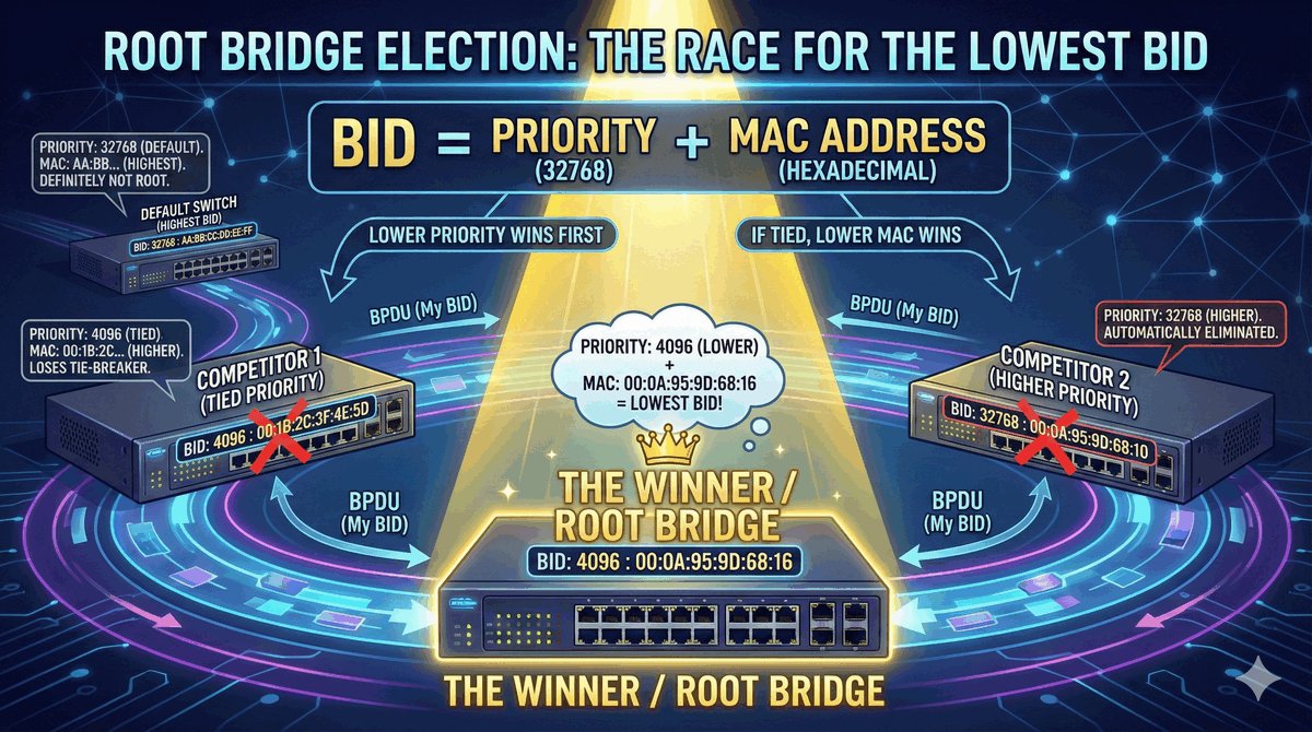 Wybór szefa (Root Bridge) opiera się na parametrze Bridge ID (BID). To kombinacja Priorytetu i adresu MAC. Wygrywa ten, kto ma najniższy numer. To bardzo ważne: domyślnie wszystkie przełączniki mają ten sam priorytet, więc szefem zostaje... ten najstarszy (z najniższym adresem MAC).
