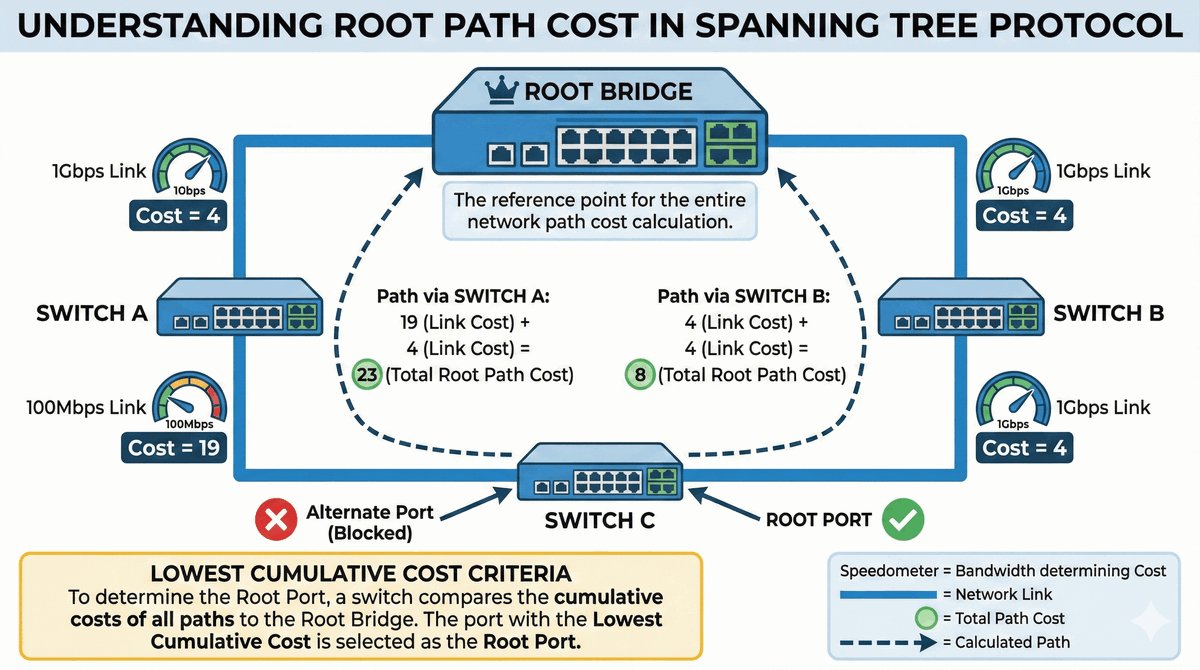 Switche nie liczą liczby kabli, ale ich prędkość. Każdy standard ma swój koszt: kabel 10 Gb/s ma koszt 2, 1 Gb/s ma koszt 4, a stary 100 Mb/s aż 19. STP zawsze wybierze drogę o najniższej sumie kosztów.