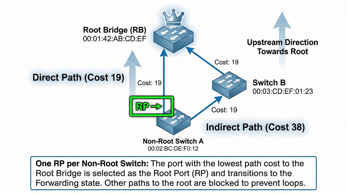 Root Port jest zawsze aktywny i święty — jeśli on padnie, cała gałąź sieci zostaje odcięta, dopóki STP nie wyliczy nowej drogi przez inny, dotychczas zablokowany kabel. To fundament nawigacji wewnątrz sieci lokalnej.