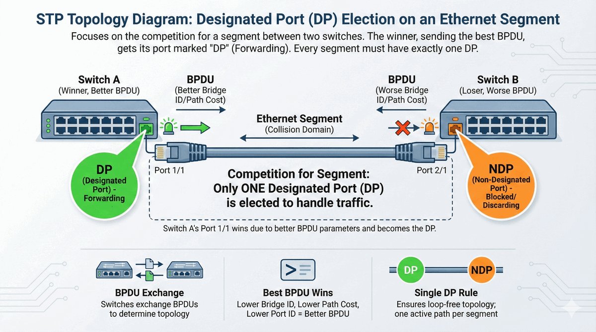 Na każdym kablu łączącym dwa switche musi być jeden pan i władca — Designated Port (Port Wyznaczony). To port, któremu STP pozwoliło przesyłać dane na ten konkretny odcinek sieci. Wszystkie porty na samym szefie (Root Bridge) są automatycznie portami wyznaczonymi.