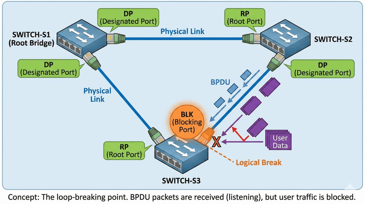 Port Blokowany (Blocking) to bohater drugiego planu. Nie przesyła on żadnych Twoich danych, nie świeci na zielono, wydaje się bezużyteczny. Ale to on ratuje sieć przed pętlą. Cały czas „nasłuchuje", czy reszta sieci żyje.