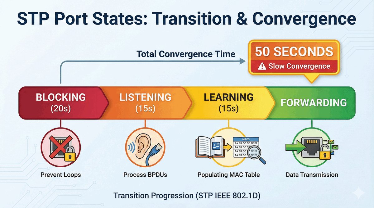 Port w STP nie włącza się od razu. Zanim zacznie przesyłać Twoje dane (Forwarding), przechodzi długą drogę: od blokady, przez nasłuchiwanie (Listening), aż po naukę adresów MAC (Learning). Cały ten proces trwa aż 30-50 sekund.