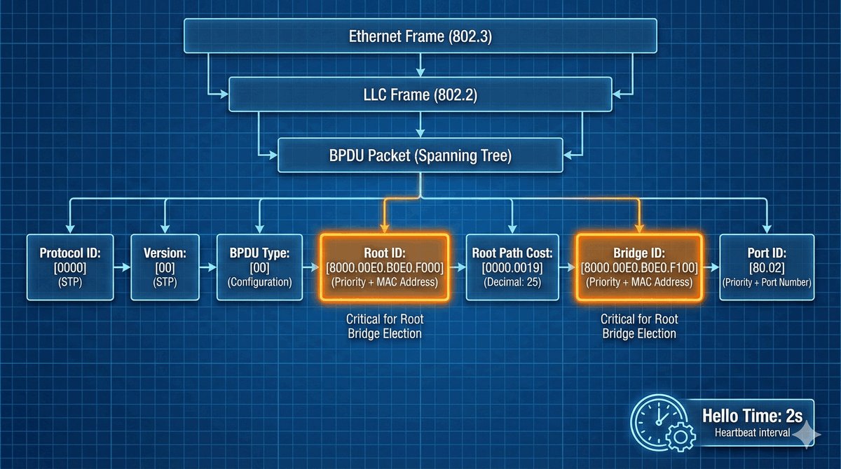 Switche nieustannie do siebie szepczą za pomocą ramek BPDU. Co 2 sekundy wysyłają do sąsiadów informację: „Cześć, ja wciąż żyję, szefem jest ten switch, a koszt do niego to tyle i tyle". To bicie serca sieci Spanning Tree.