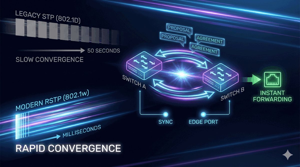 Cierpliwość administratorów ma swoje granice — 50 sekund czekania w starym STP to w dzisiejszych czasach wieczność. Dlatego powstał RSTP (Rapid STP). Działa on niemal identycznie, ale... błyskawicznie. Czas naprawy sieci skrócił się z minuty do zaledwie kilku milisekund.