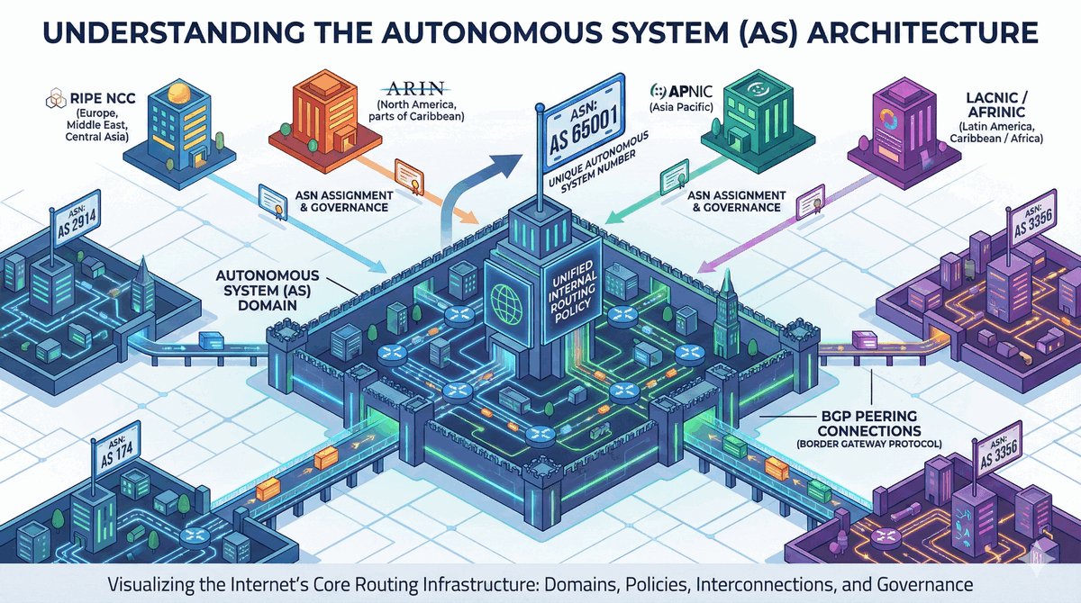 Numery te (np. AS 1234) są przydzielane przez globalne organizacje. BGP używa tych numerów, aby wiedzieć, przez czyje „terytorium" przepływają dane. Jeśli Twoja firma staje się na tyle duża, że ma kilku dostawców internetu, prawdopodobnie sama będzie musiała wystąpić o własny numer AS i zacząć „rozmawiać" w języku BGP.