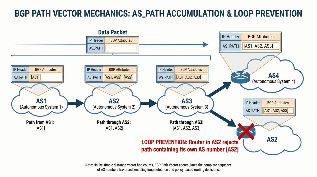 BGP nie patrzy na dystans (metrykę). On patrzy na ścieżkę (Path Vector). Każda informacja o trasie niesie ze sobą listę Systemów Autonomicznych, przez które przeszła. To jak zbieranie pieczątek w paszporcie na każdej granicy.