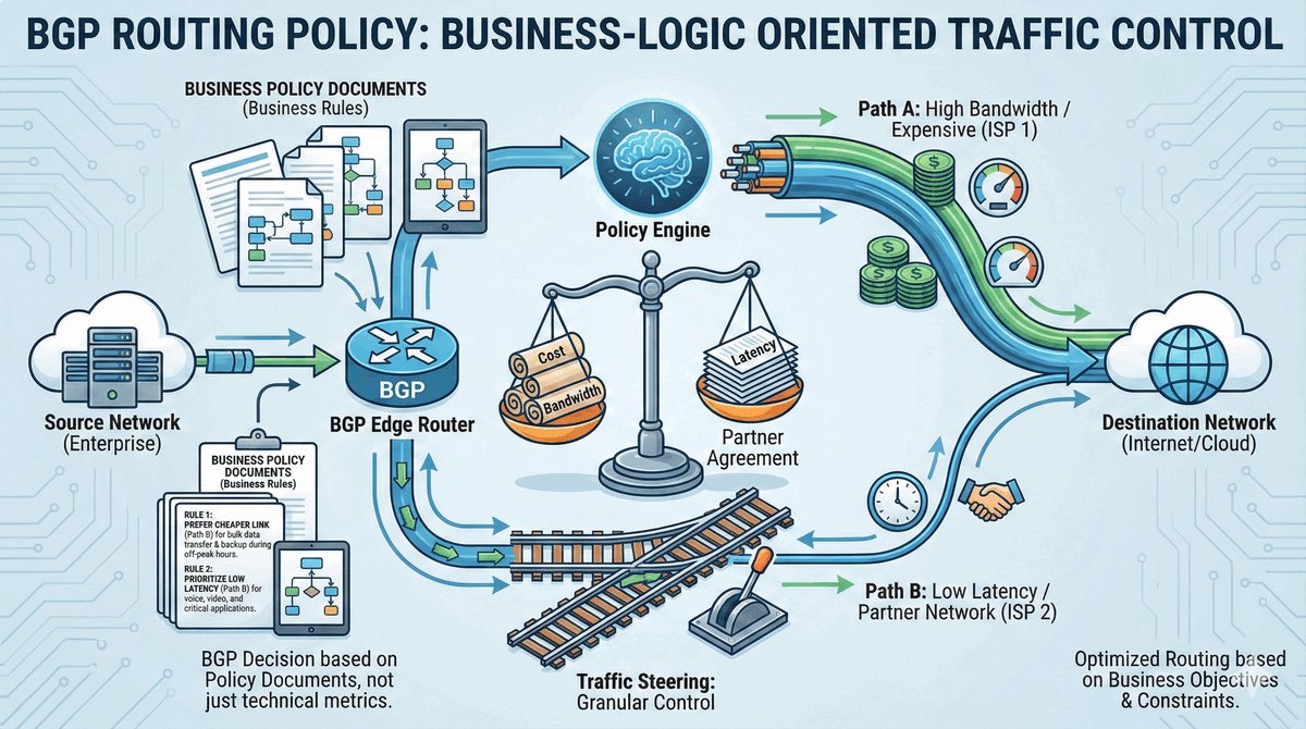 Siła BGP leży w jego elastyczności. Wewnątrz firmy (IGP) chcemy po prostu „najszybciej". W BGP chcemy „zgodnie z planem". Administrator może kazać routerowi: „Wysyłaj ruch do Google przez łącze A, bo jest tam darmowy peering, a ruch do Netflixa przez łącze B, bo mamy tam lepszą umowę".
