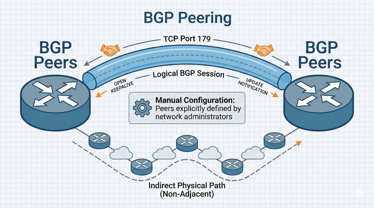 Do rozmowy BGP używa solidnego protokołu TCP (port 179). Dzięki temu routery nie muszą stać obok siebie — sesja BGP może być zestawiona między Warszawą a Nowym Jorkiem, o ile tylko istnieje między nimi łączność IP. TCP gwarantuje, że żadna informacja o trasach nie zginie i dotrze w całości do celu.
