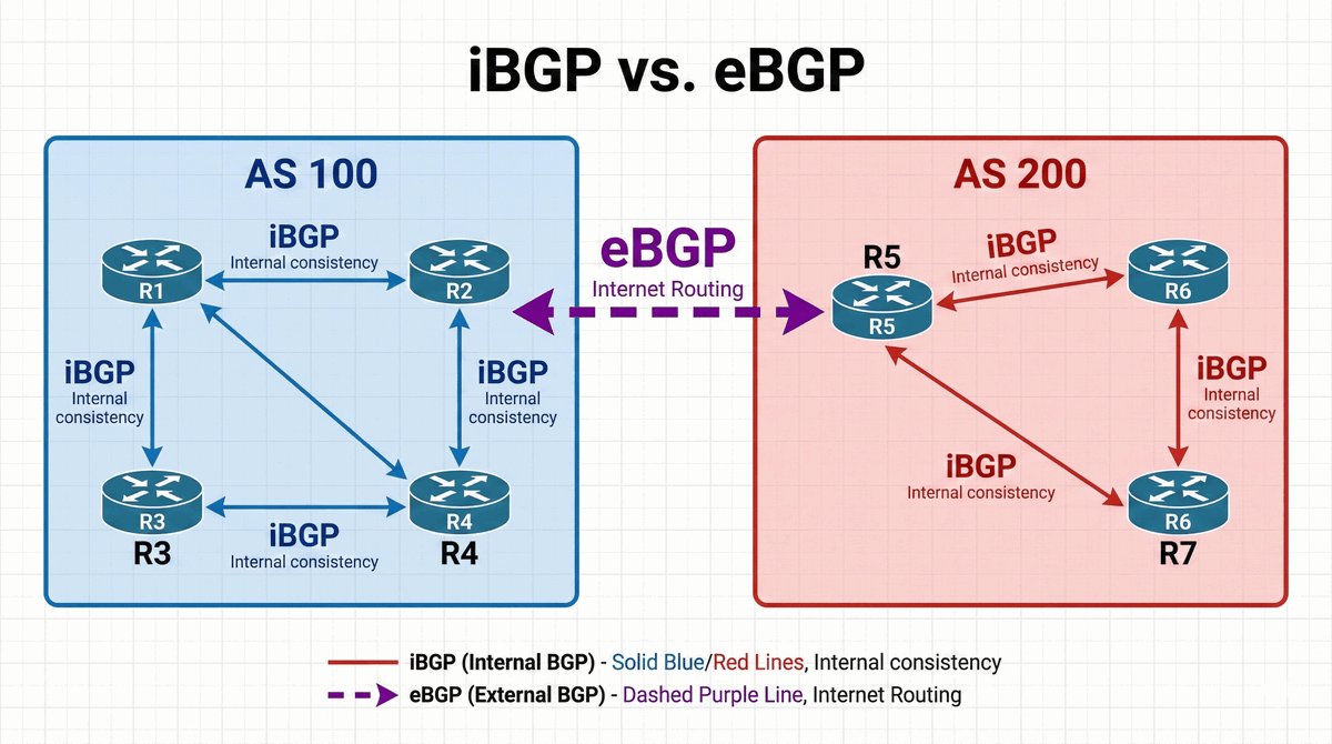 BGP ma dwie twarze w zależności od tego, z kim rozmawiamy. Gdy łączymy się ze światem zewnętrznym (innym numerem AS), mówimy o eBGP (External). To tutaj dzieje się cała magia internetowego routingu.