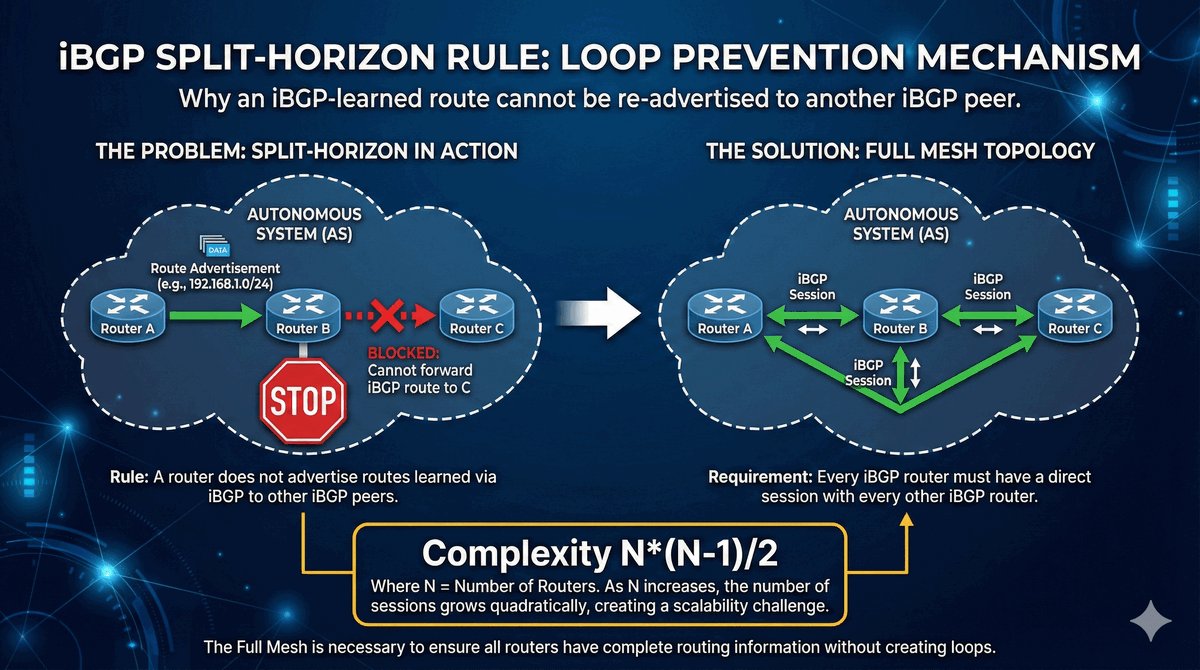 Skutkiem tego jest wymóg full mesh — każdy router iBGP musi być połączony z każdym innym routerem iBGP bezpośrednią sesją. W wielkich sieciach bywa to uciążliwe, dlatego inżynierowie stosują „wzmacniacze sygnału", czyli route reflector, które pozwalają na obejście tej zasady i zachowanie porządku w konfiguracji.